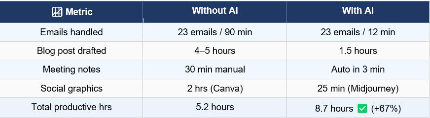 After a full day living with AI, the numbers tell a compelling story. Here is the side-by-side comparison of key productivity metrics: