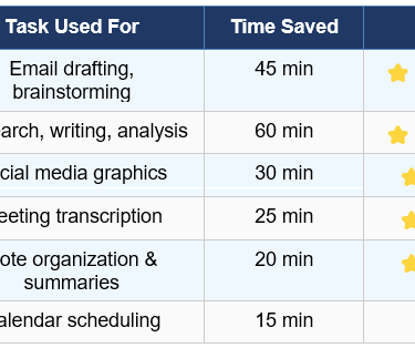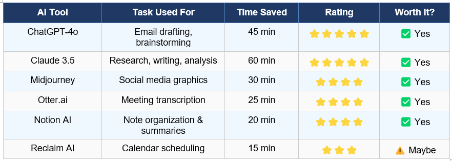 Based on this experiment and broader benchmarking, the top three time-savers are: (1) AI writing assistants like Claude or ChatGPT for content and email, saving 45–90 minutes daily; (2) Meeting transcription tools like Otter.ai, saving 25–40 minutes; and (3) AI scheduling assistants like Reclaim, saving 15–20 minutes of calendar management.