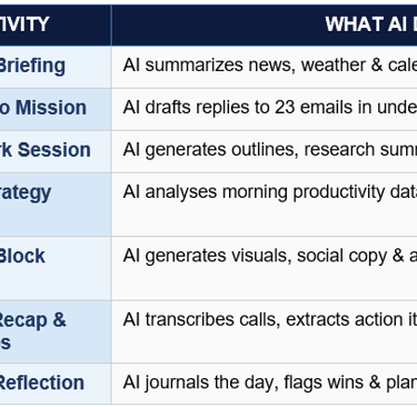 Here is the complete AI-powered daily workflow, from sunrise to shutdown. Think of this as the blueprint for how to use AI for everyday tasks in a realistic professional setting.