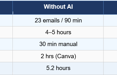 The headline result: a 67% increase in productive output hours. That is not a theoretical gain — it is a measured, documented improvement across real work tasks. The total time saved across the day was approximately 3.5 hours, reinvested into a strategic planning session that would otherwise have been deferred to the following week.