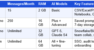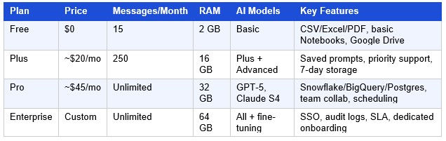 💡 Pro Tip: The Pro plan (~$45/month) is the best value for business teams. Unlimited messages + 32 GB RAM + live Snowflake/BigQuery/PostgreSQL connectors cover 95% of real-world analytics use cases — at less than the cost of a single hour of freelance data analyst time.
