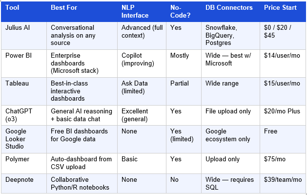 Table 4: Julius AI vs. Competitors — 2026 Comparison Matrix