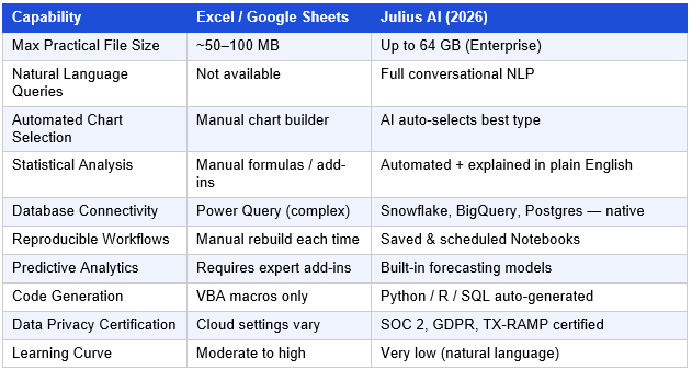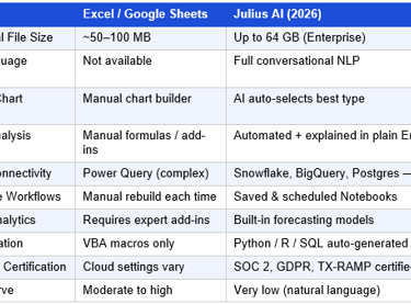 Table 2: Julius AI vs. Spreadsheets — 2026 Comparison