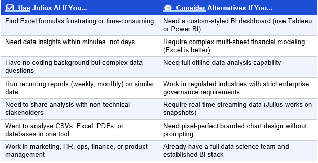 Table 5: Julius AI — Honest Verdict: Use It vs. Skip It