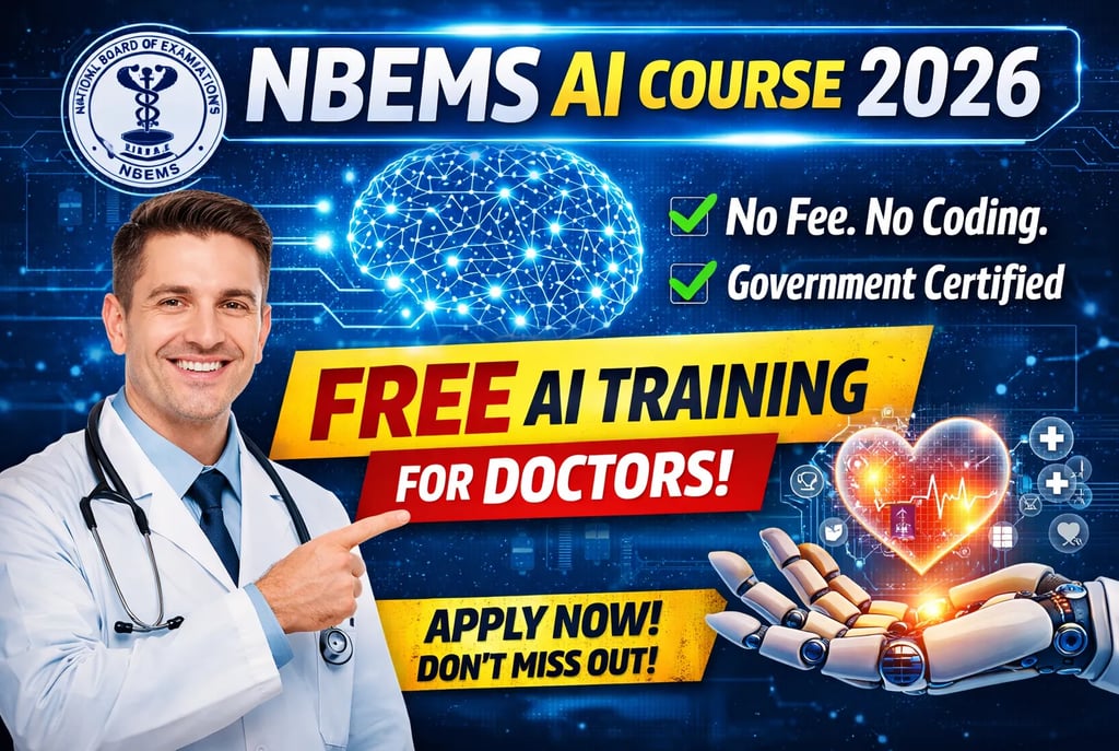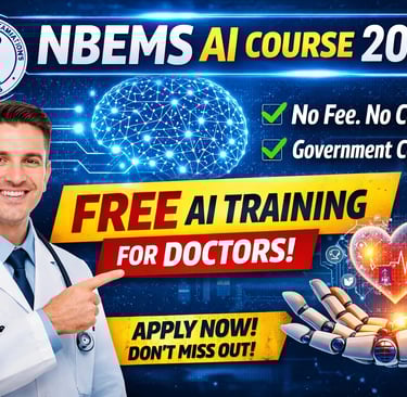 Discover the NBEMS AI Course 2026 – a free government program for doctors. Learn eligibility, benefits, syllabus, and how to enroll in this future-ready medical AI course.