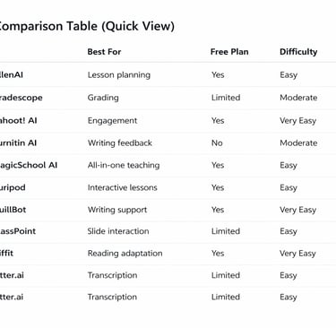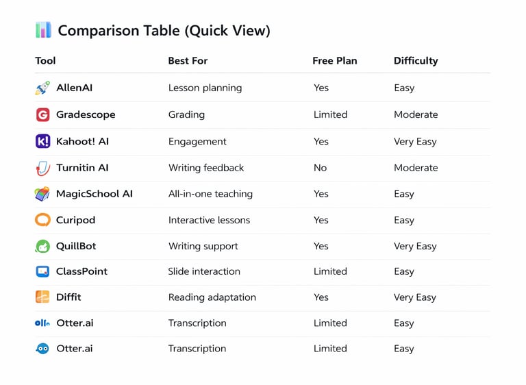 Key Tools: AllenAI, Gradescope, Kahoot! AI, Turnitin AI, MagicSchool AI, Curipod, QuillBot, ClassPoint, Diffit, Otter.ai.