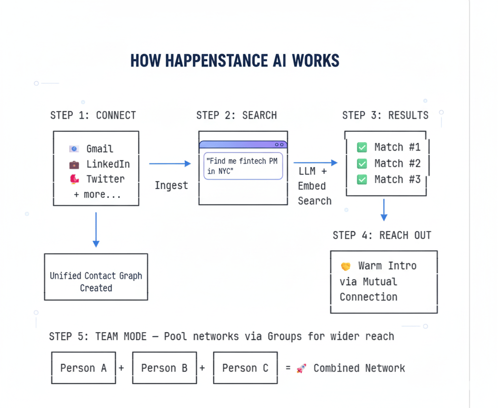 As professional communities have become more globally distributed and more niche, the need to search across fragmented networks has grown. Your relevant contacts might be scattered across LinkedIn connections, email threads from five years ago, and Twitter followers you haven't spoken to in months. Happenstance AI unifies all of these into a single searchable layer, which is especially powerful for remote professionals and distributed teams.
