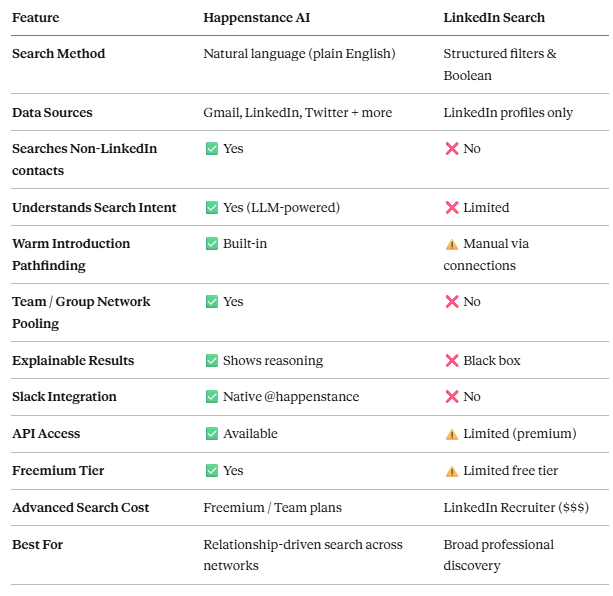 Happenstance AI vs LinkedIn Search: Full Comparison Table
